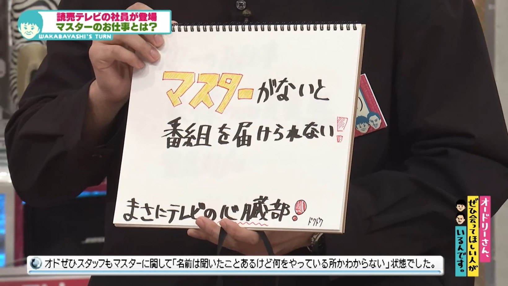 藤本さんは読売テレビの「マスター」で働く社員。「マスターって何?」というオードリーの疑問を解消するため、モニターにマスター室の写真が映し出された。さらに藤本さんが持参したフリップで説明をする。