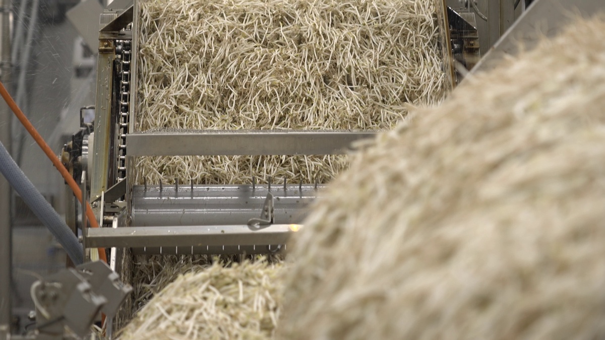2つ目はモヤシの根っこを切り取る工程。モヤシには根っこがあり、1本1本カットしなければならない。モヤシはシャッシャッシャッと音を立てて、根切り機の上を流れていく。