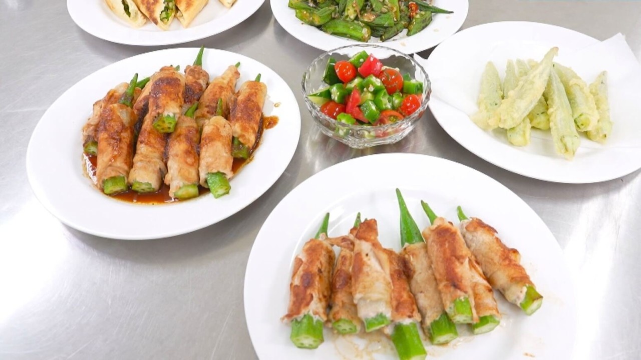 さらに、人気ナンバーワンの「オクラの天ぷら」、ミニトマトときゅうりで和えた「オクラのサッパリサラダ」など5品が完成しました。