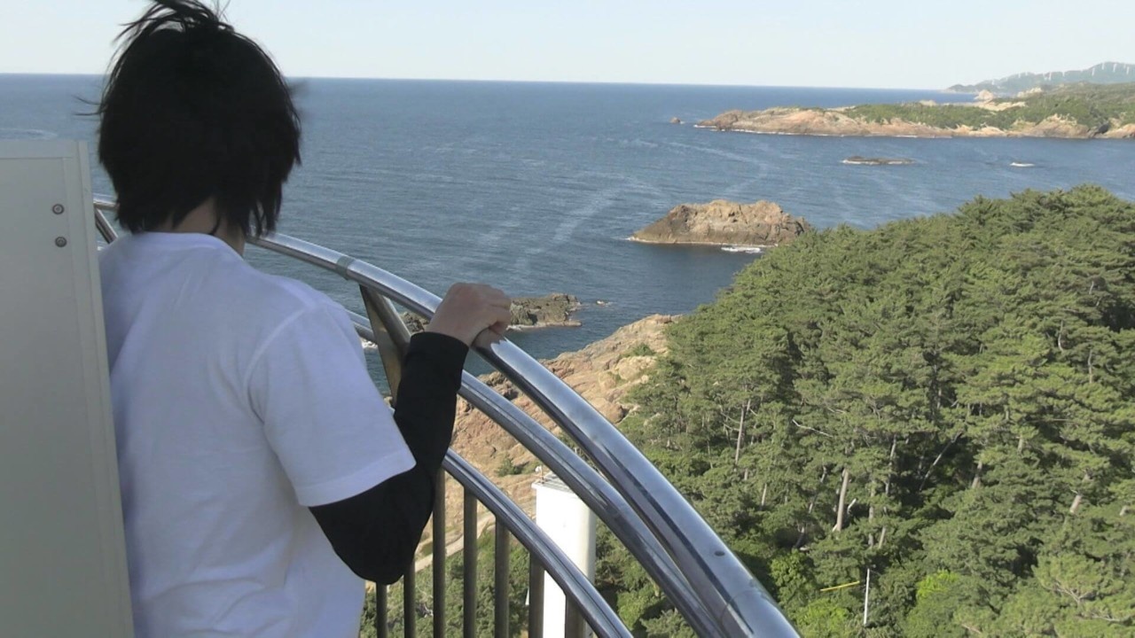 ながつは、灯台の中の螺旋階段を上り、高さ38mのところにある展望台へ。幅1mほどしかない展望台の通路はスリル満点。ながつは「ああ~怖い!脚がビクビクする」と、しどろもどろに。しかし、高さに慣れると「めっちゃきれい!最高!」と、日本海が広がる絶景を存分に楽しみました。ここから、本題のしりとりへ!