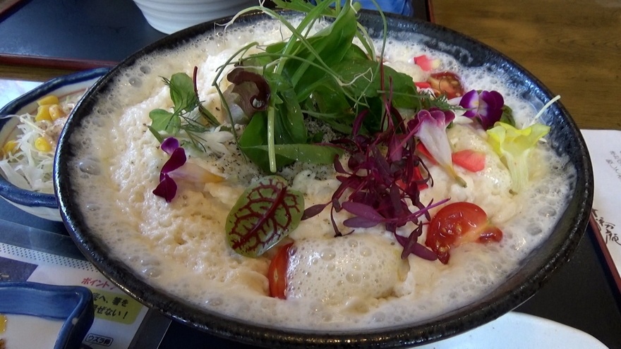 14年の間に、豊橋カレーうどんは進化を続けています。「十勝庵」の「白い豊橋カレーうどん」は、とろろごはんの上に大量のチーズをのせ、香りづけにバーナーでひと炙り。自家製麺、自家製カレーをのせ、うずらの卵とチーズをムースのような泡状にした「エスプーマ」をかけます。トッピングは豊橋産の水菜とエディブルフラワーです。