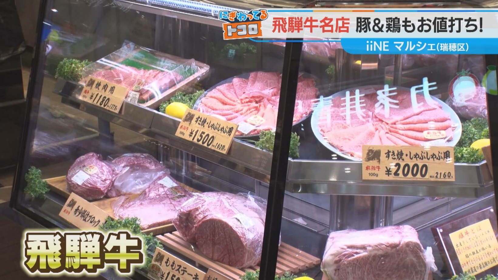 次は肉を求めて、飛騨牛の名店「丸明 瑞穂店」を訪れた若狭アナ。ずらりと並ぶ飛騨牛の魅力に目を奪われつつ、豚肉売り場で6パックも手にする買い物客の姿を発見しました。