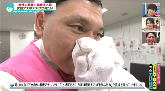 「春日さん?」と、中継先に声をかける若林。続けて、部署の入口に置いてある「アナウンス部」のパネルを見た若林は、「アナウンス部のパネルというのは、どんな味なのよ?」とムチャぶりを仕掛けます。