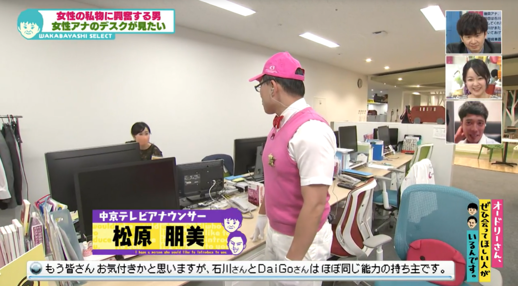 春日がチェックを進めていると、アナウンス室に松原朋美アナの姿を発見!以前『24時間テレビ』で共演したことについて松原アナが、「先日はありがとうございました!」と丁寧に頭を下げると、若林は「ここで『24時間テレビ』の話はやめて!」と話を遮って笑いを誘います。