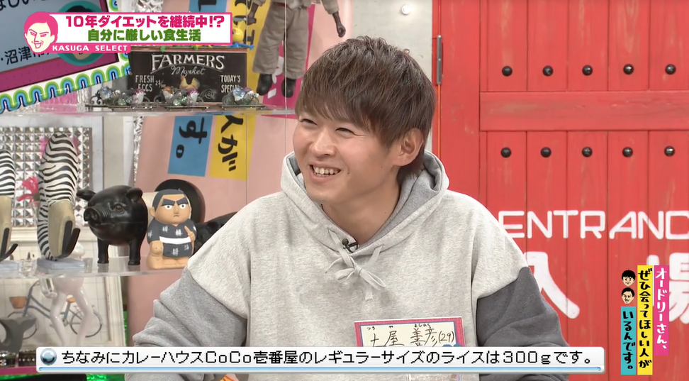 そんな土屋さんのダイエット方法は、おもに「食事制限」なのだとか。月曜日から土曜日は食べるものを制限して、日曜日だけ好きなものを食べるようにしているそうです。このダイエット法を10年間続けてきた土屋さんに、オードリーの2人と磯貝アナは大きくうなずいて感心します。