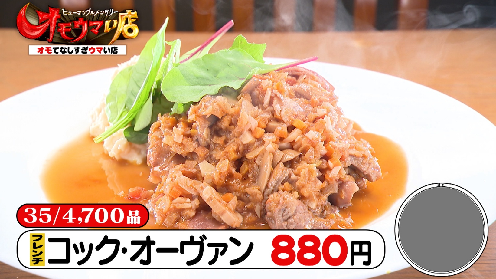 「コック・オーヴァン(880円)」は、鶏もも肉と刻み野菜を赤ワインなどで煮込んだフランス料理。本格的な料理の数々に、スタジオメンバーは店主について「元々は何の人?」と興味津々です。