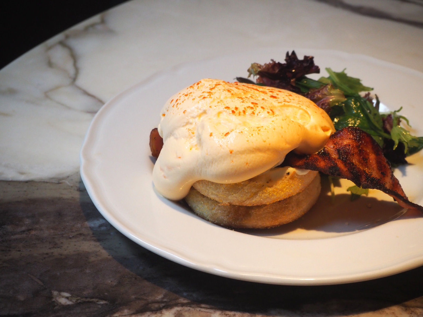 米粉入りの自家製マフィンはサクサクの食感。小麦が香るマフィン、カリカリに焼き上げながらも肉の旨味をしっかり兼ね備えたベーコンを、エスプーマで仕上げたふわふわのオランデーズソースが優しく包み込みます。
