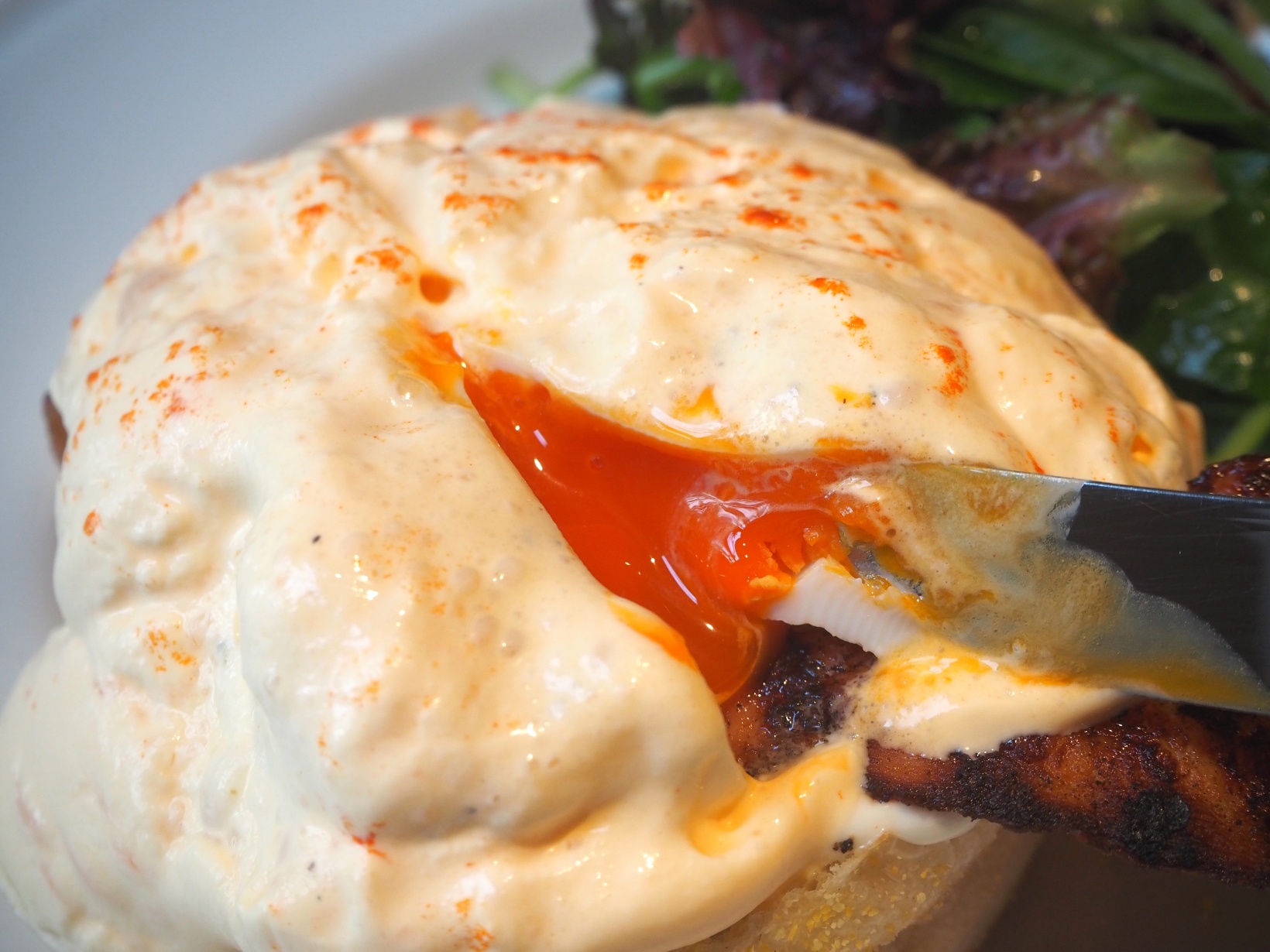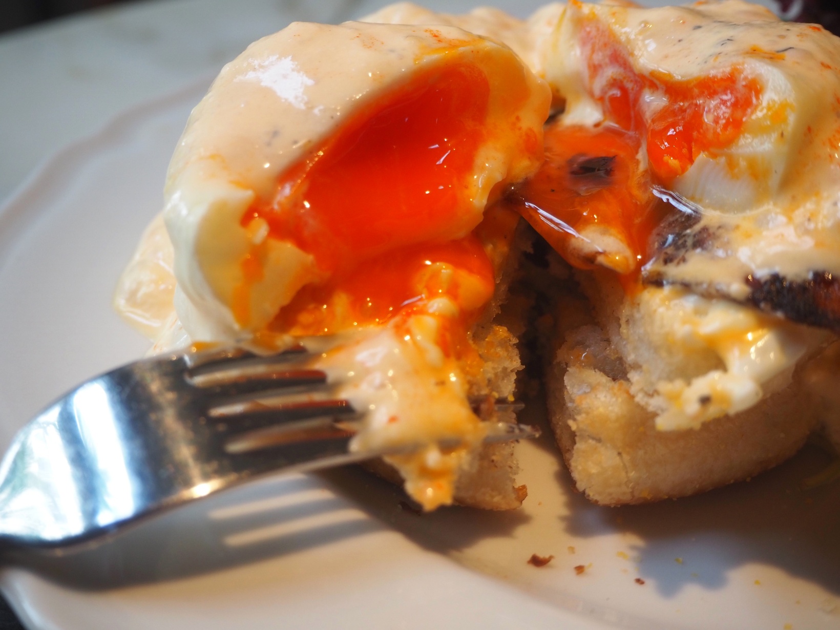 ポーチドエッグにナイフを入れると、黄身がとろり。濃厚な卵が味わいに奥深さをプラスしていきます。