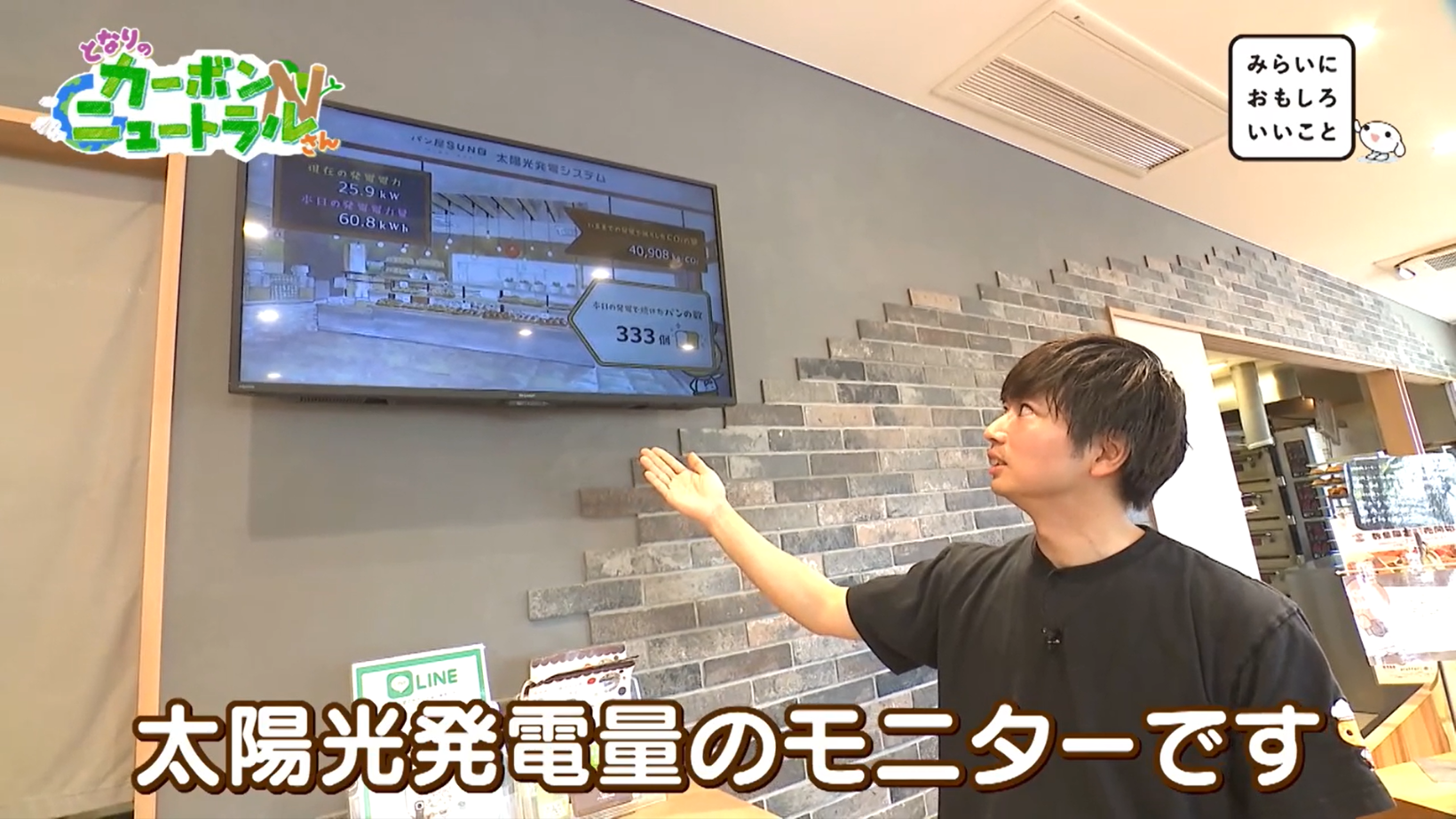 お客さんにわかりやすいように、店内には太陽光発電量のモニターを設置。モニターには発電電力や発電電力量、その日の発電で焼き上げられたパンの数が表示されています。