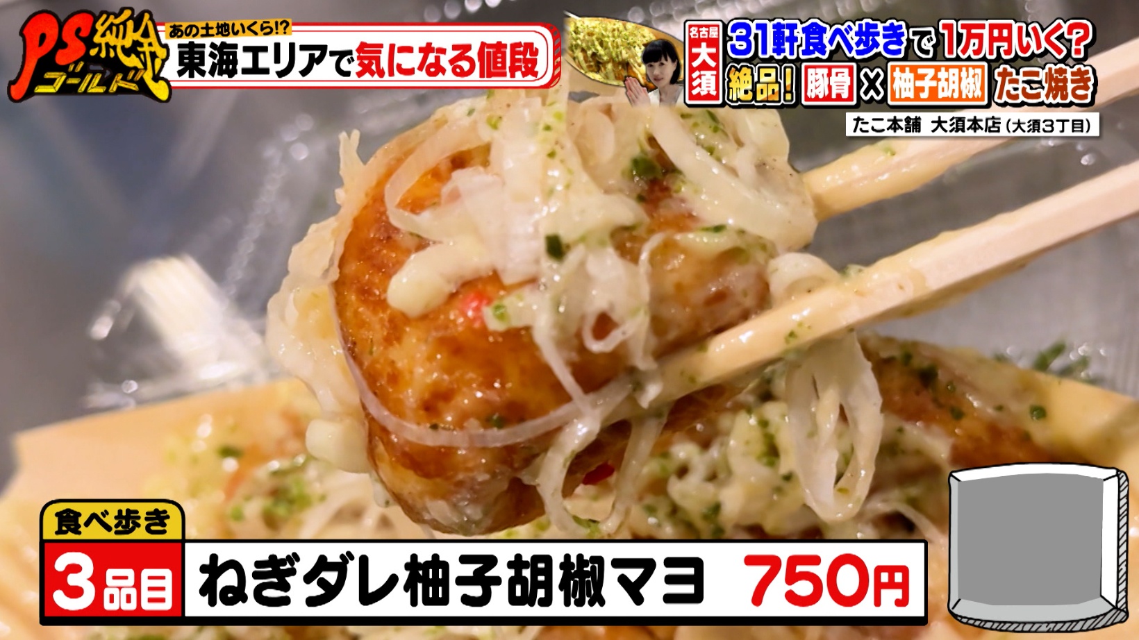 去年11月オープンの『たこ本舗 大須本店』はキッチンカーグランプリ受賞経験多数。こちらのたこ焼きは、とんこつスープ入りでうま味が濃厚です。のり子さんは熱々トロトロの「ねぎダレ柚子胡椒マヨ(750円)」を上品に完食。