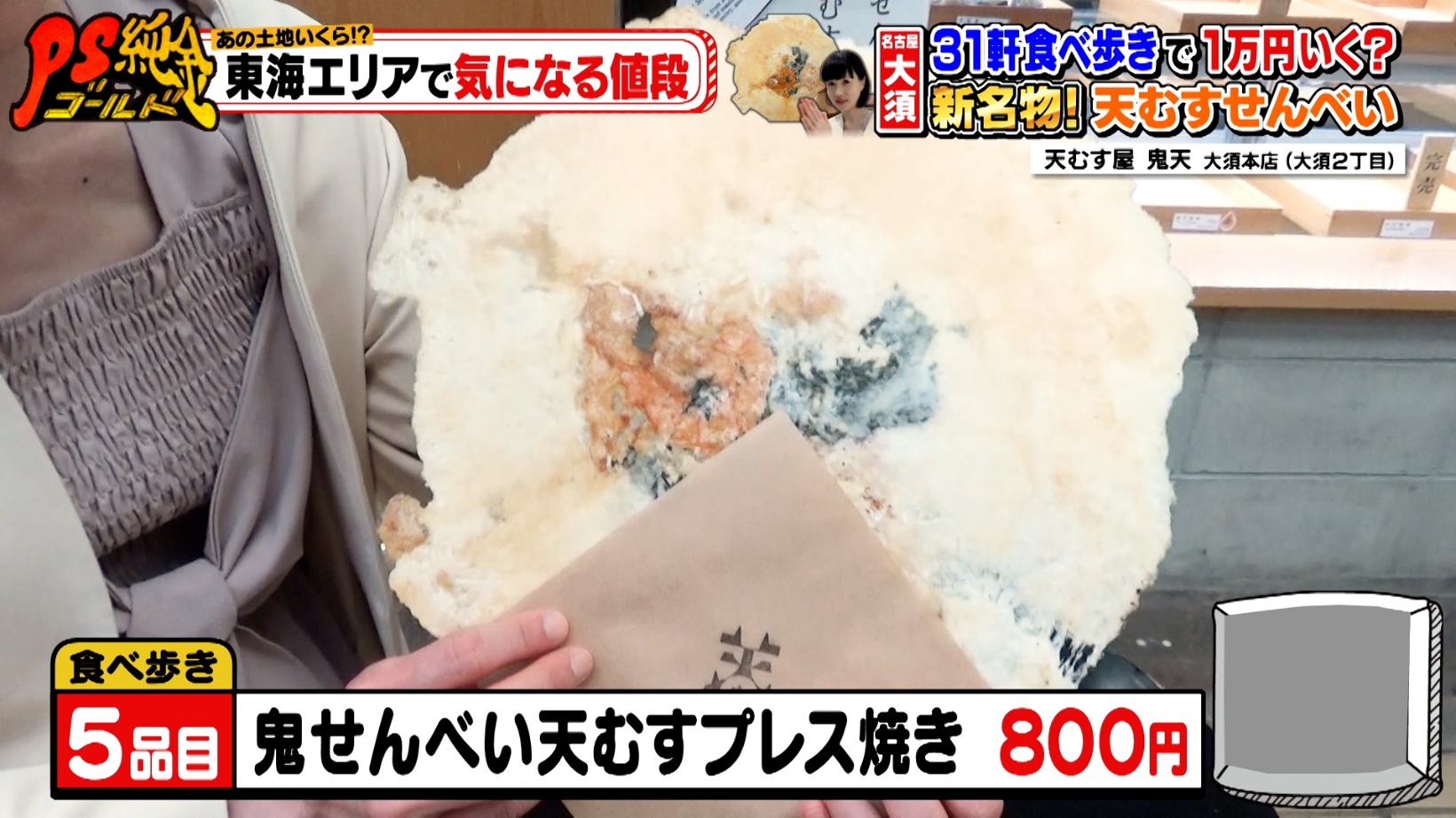 『天むす屋 鬼天 大須本店』では大須新名物にトライ。「鬼せんべい天むすプレス焼き(800円)」の天むすを1個まるごとプレスするアイデアと巨大なルックスに、スタジオメンバーも感心するばかりなのでした。
