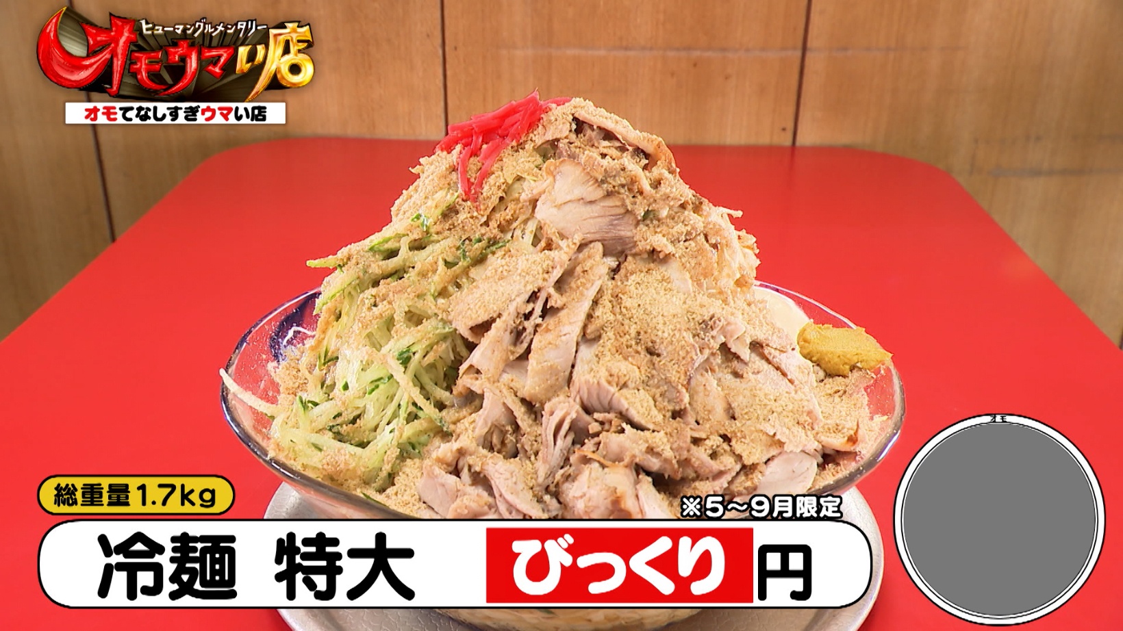 金魚鉢のように大きな器に盛られた「冷麺(特大・1,200円)」は、麺2玉に、山盛りの千切りキャベツ、千切りキュウリ、自家製チャーシューがどっさり盛られています。迫力のビジュアルにスタジオから歓声が上がります。