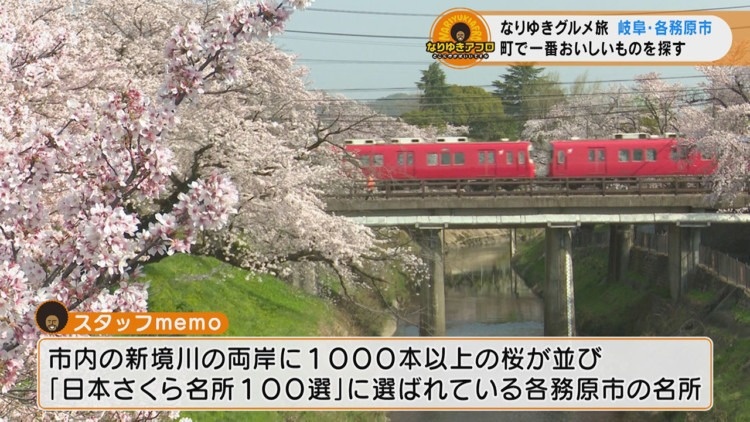 ロケ日は春爛漫の4月1日。各務原市内を流れる新境川の両岸には1,000本以上の桜が並び、「日本さくら名所100選」にも選ばれています。今日のなりゆき旅はここからスタート!