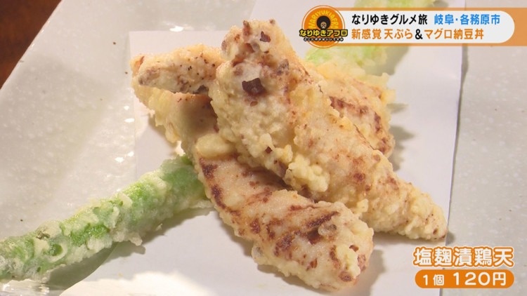 早速取材交渉したところ、OK!こちらは、発酵調味料と天ぷらを融合させたお店で2年前に始めたそう。Iさんおススメの「塩麹漬鶏天(1個120円)」は鶏のササミを自家製の塩麹に一晩漬けこみ、太白ごま油やオリーブオイルなどを調合したオリジナルの揚げ油でカラッと仕上げた人気の品。Iさんの息子さんが大好きな「マグロ納豆丼(680円)」と一緒にいただきます。
