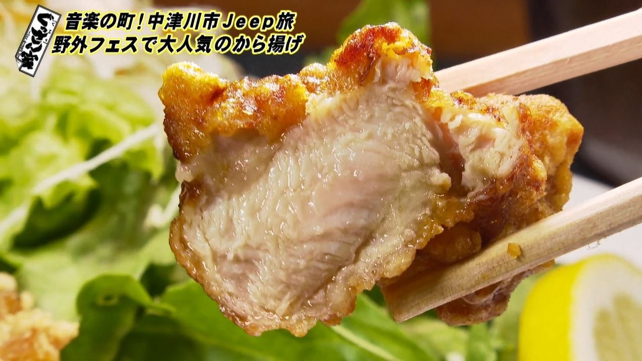 揚げたての大きな唐揚げを頬張り「おいしい!ジュワジュワですわ。肉汁が。きめ細やかな身で締まっているんですけどやわらかい。しょう油ベースのタレについてるこの風味もいいですね。これはフェスで食べたくなる!」と絶賛!