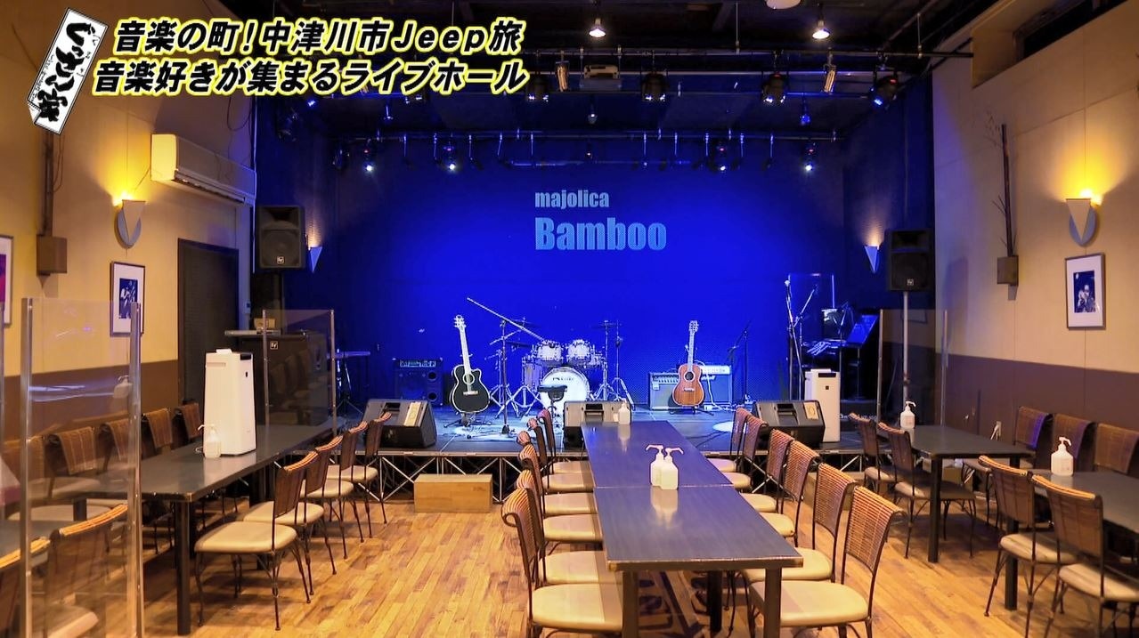 レストランのすぐ隣にあるのがライブホールの『マジョリカ バンブー』。ジャンルやプロ・アマ問わず、音楽好きが集まる交流の場にしたいと作られました。ぐっさんも「うわ!かっこいい。ガッツリライブハウスじゃないですか!」と驚くほど本格的なステージです。