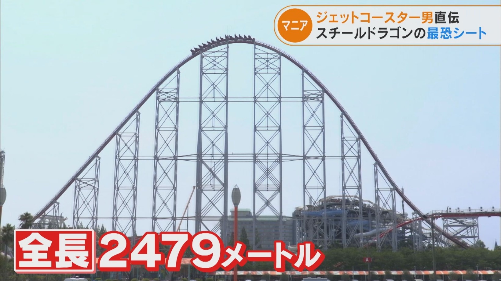 まずは、世界最長コースター「スチールドラゴン2000」の“1番 怖い席”。超人気コースターで、最大の特徴は高さ日本一を誇る97mからの急降下と、世界一のコース全長は2479m。ギネス記録になっています。