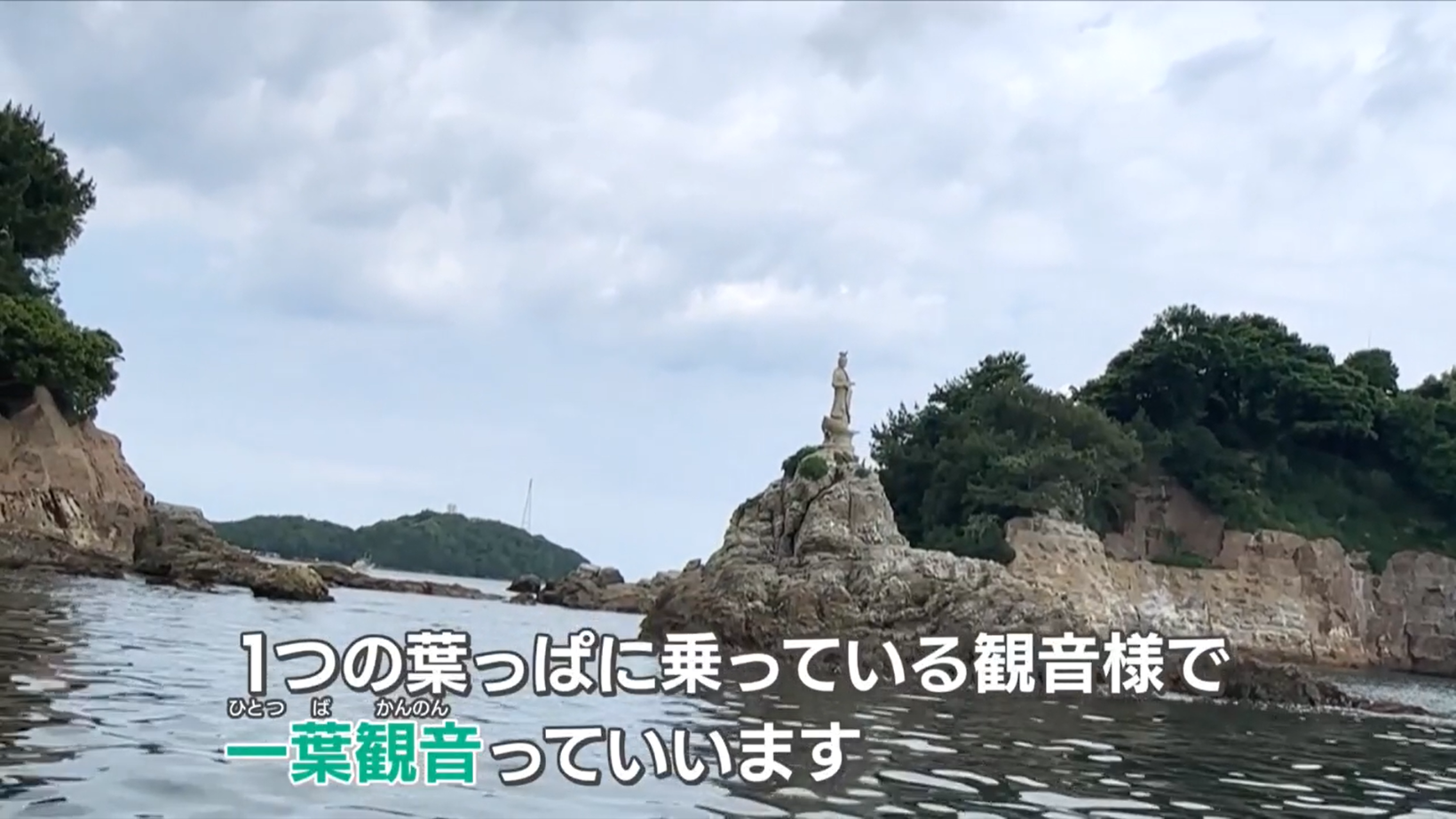 愛知県の常滑焼で作られている観音像“一葉観音”は、1つの葉っぱに乗っている姿が特徴。スタッフによると、海上安全を祈願する観音像で、この周辺は海女さんたちが潜る海なのだそう。