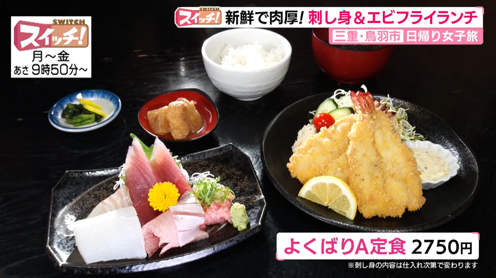 この日の刺身は、三重県産のビンチョウマグロや鳥羽市産のアオリイカ、志摩市産のブリなど5種類。衣に米粉を使用したエビフライは、身を開いて揚げることで香ばしくサクサクとした食感に仕上げた一品です。