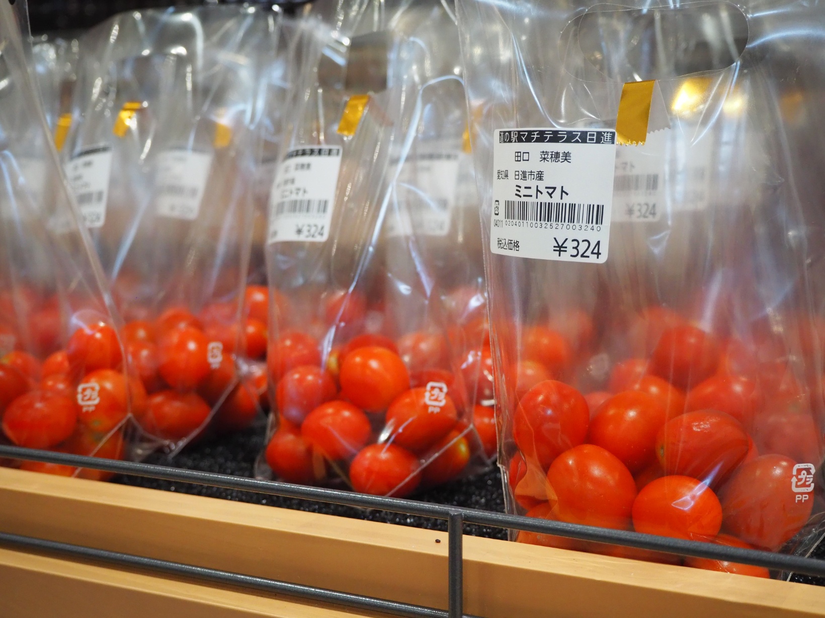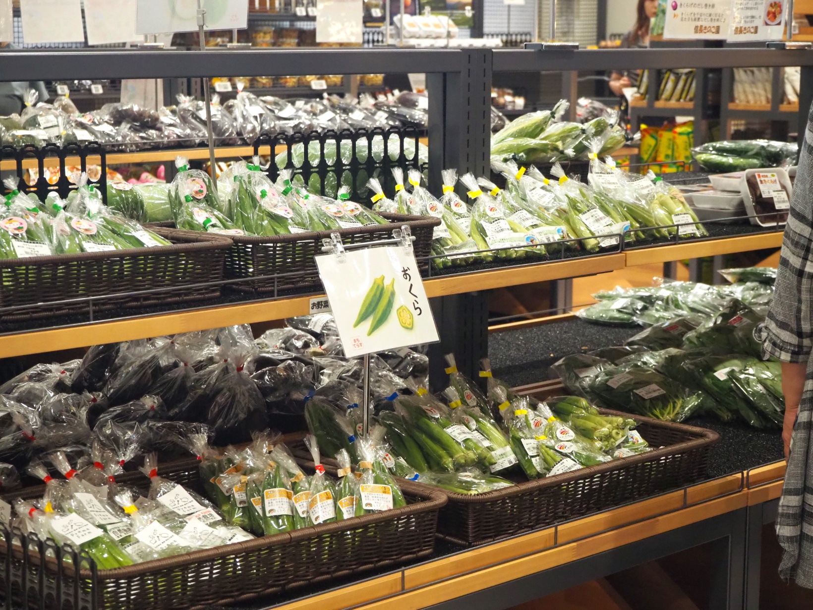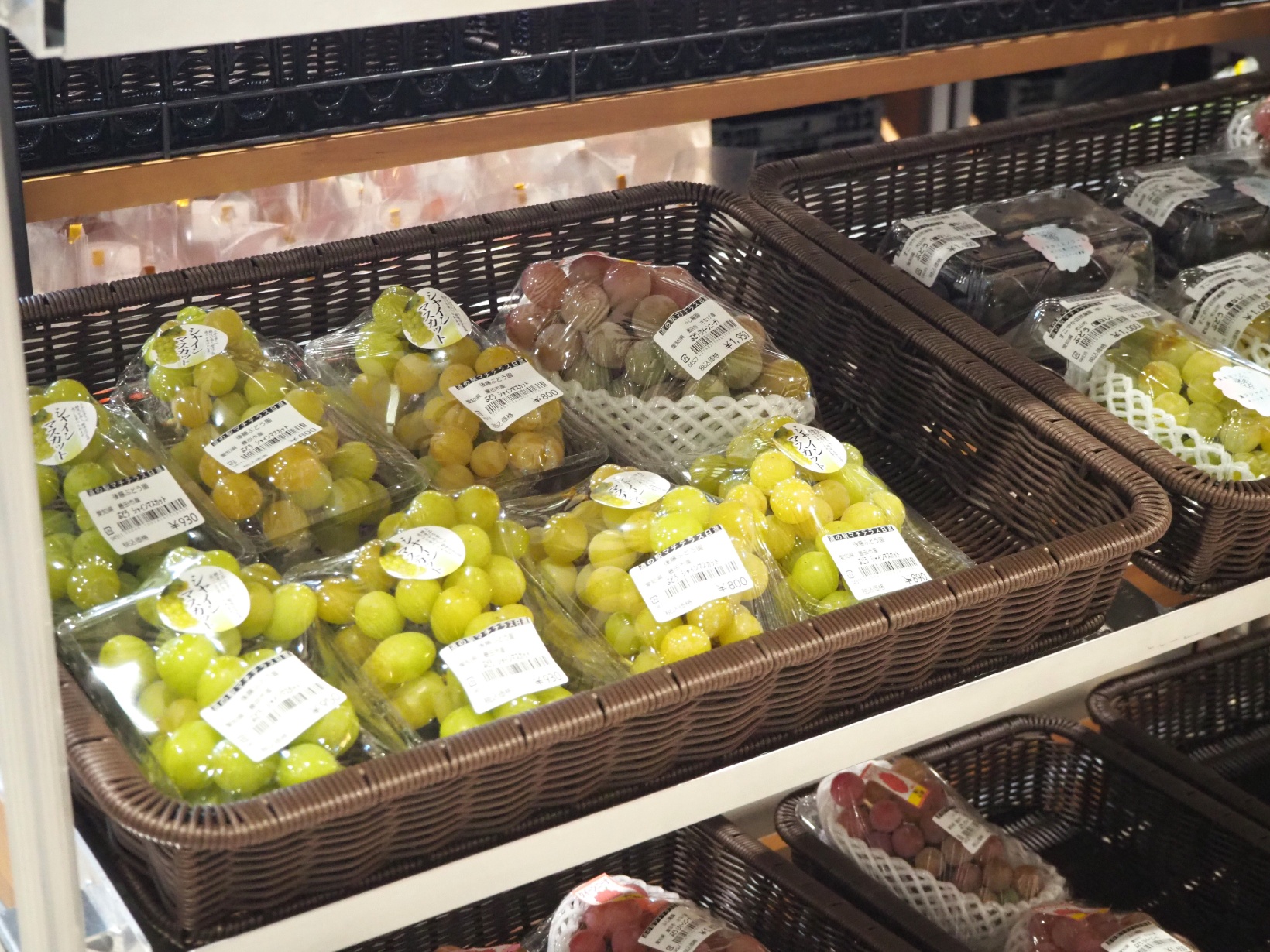 農産物エリアの品揃えも豊富!エリア内の棚には、トマトやピーマン、トウモロコシなど野菜から、ブドウやナシなど多彩な農産物がずらりと並びます。
