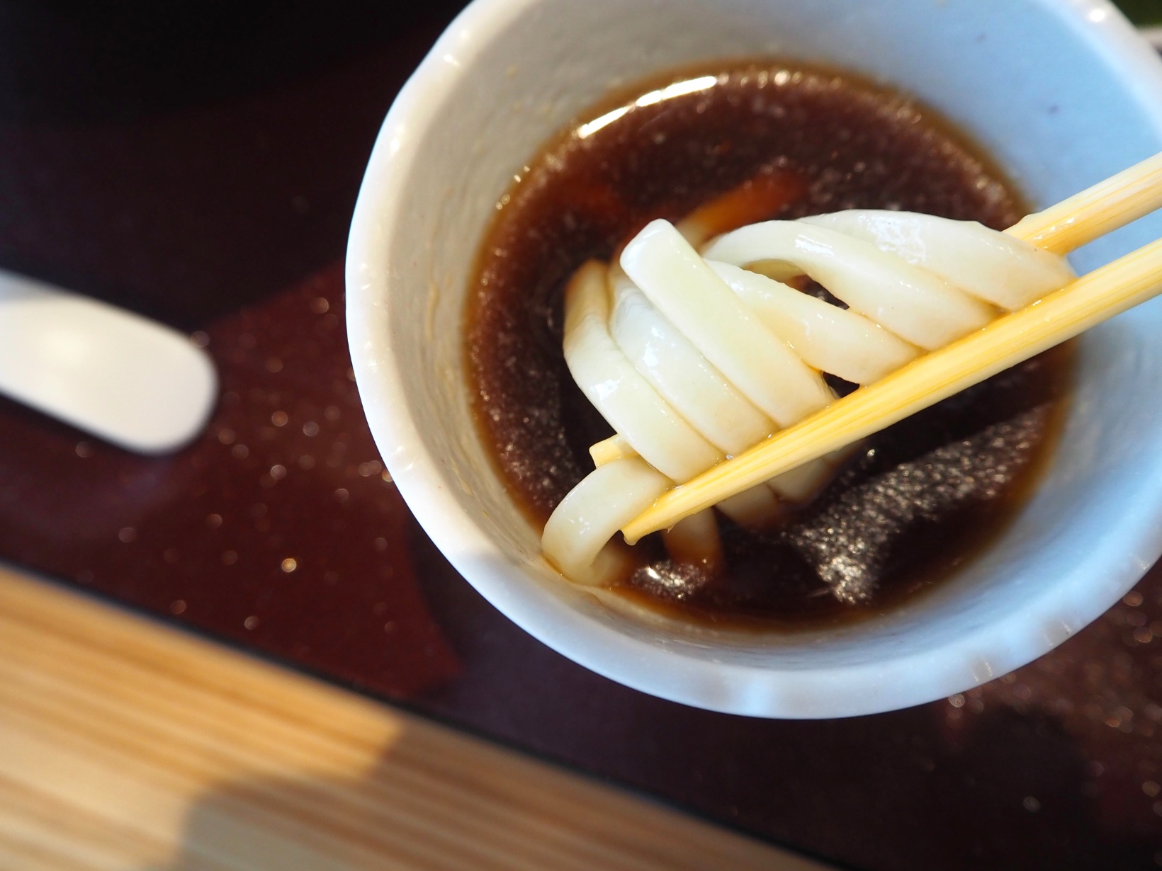 1回目はつけ汁につけて「ざるうどん」として、2回目は大葉ジェノベーゼとつけ汁をうどんにかけていただきます。つけ汁は少しずつかけて、好みの味に調整していくのがポイントです。