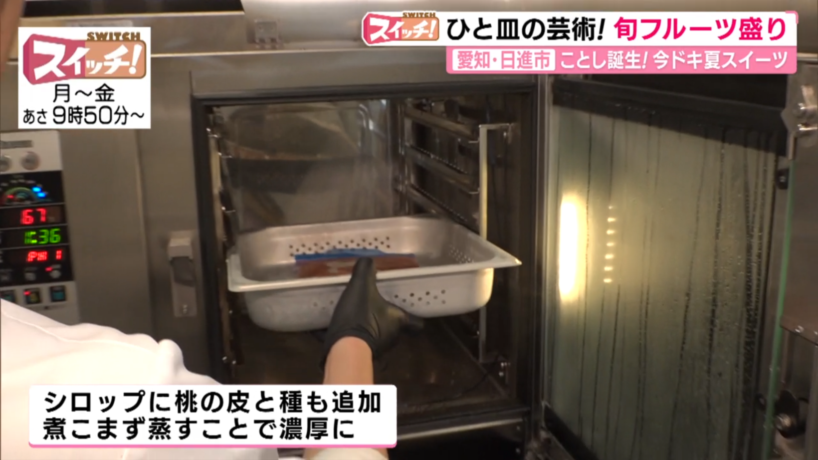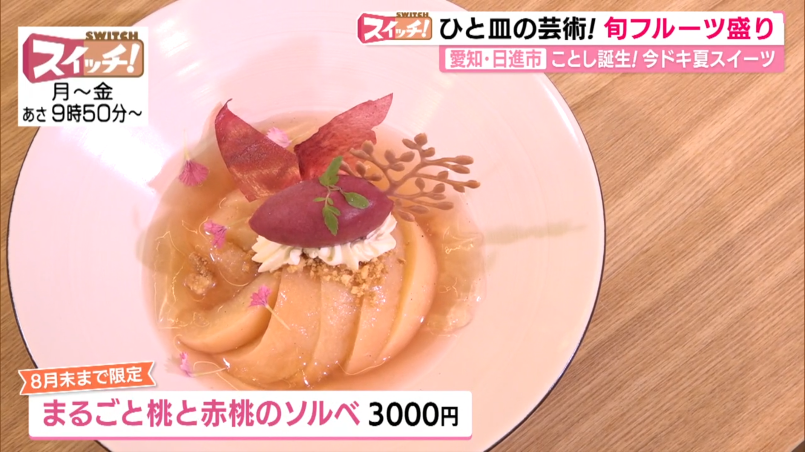 動画では、桃のコンポートを使用した「まるごと桃と赤桃のソルベ」(3,000円)が登場。