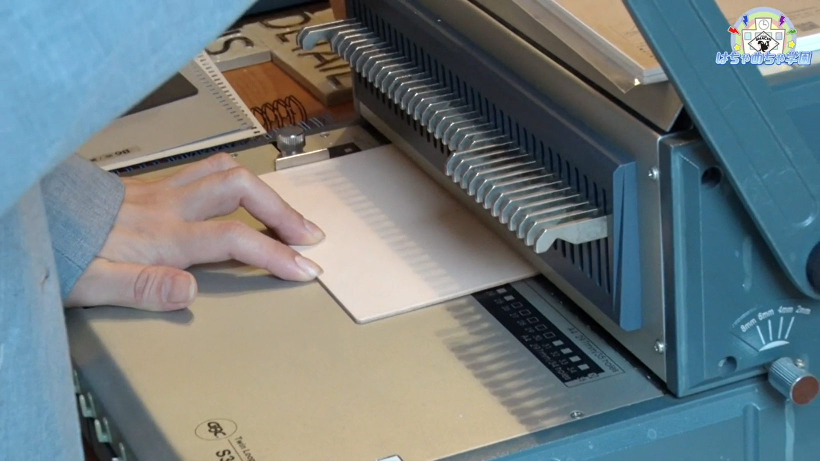 リングの色を選んだら、専用の機械で紙にリングを通すための穴を開けていきます。表紙と裏表紙、中の紙を揃え、リングを付けたら完成です。
