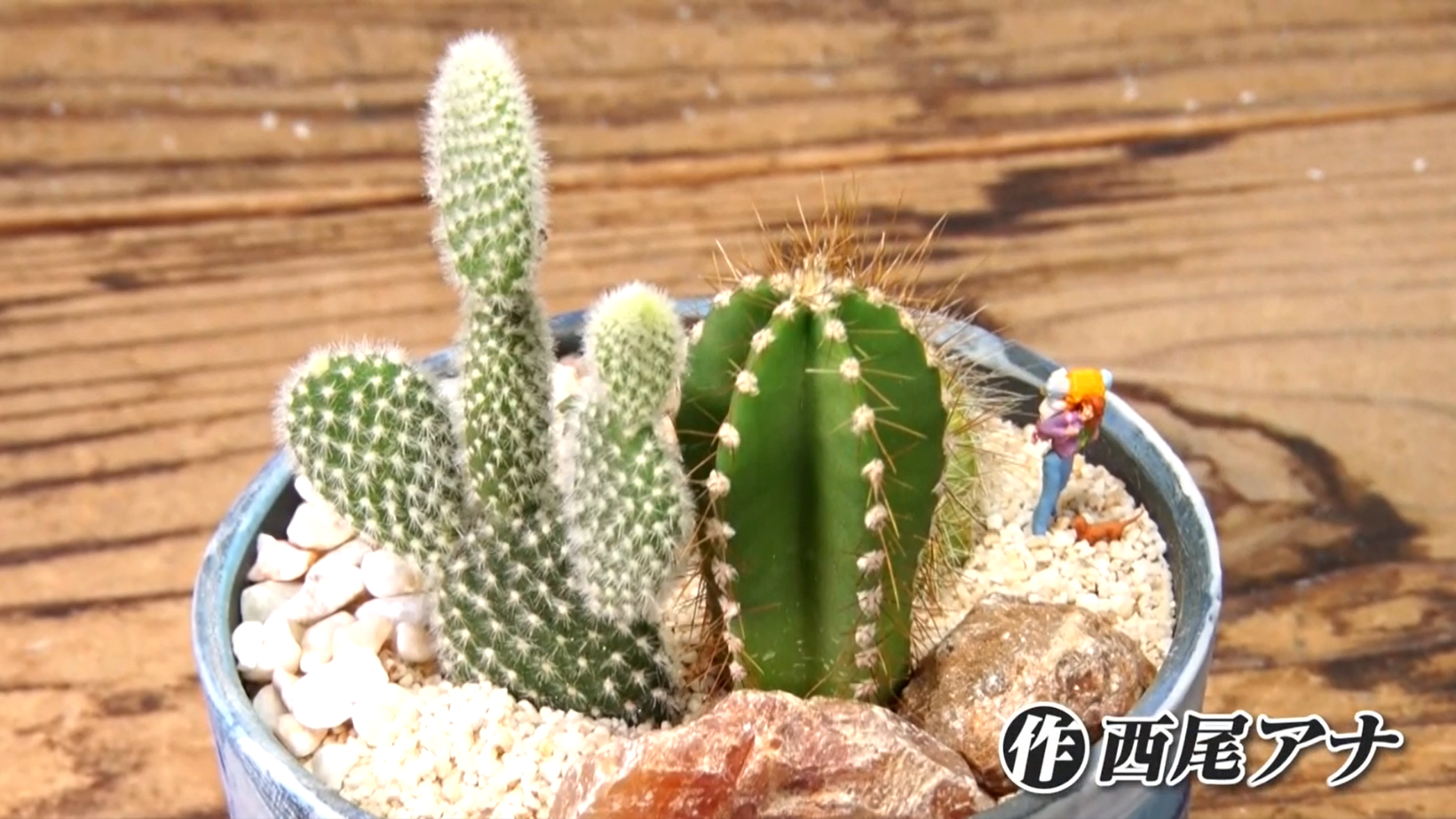 没頭すること30分、ついにサボテンの寄せ植えが完成!人型のミニフィギュアを自身に見立て、背丈の高いサボテンに出合えた感動や感激を寄せ植えで表現しました。