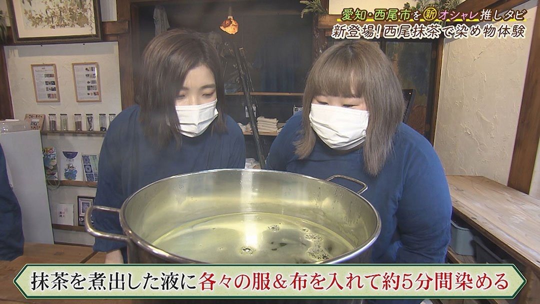 店舗では販売の他に、毎週土曜日開催の様々な「染め体験」(2200円~ ※1団体600円~開催/要予約)が大人気!世界にたった1枚のオリジナルTシャツやハンカチなどが作ることができます。さらに4月からは新コースが始まり、3人が体験してみることに。それは「西尾産の抹茶を使った染め物体験」です。