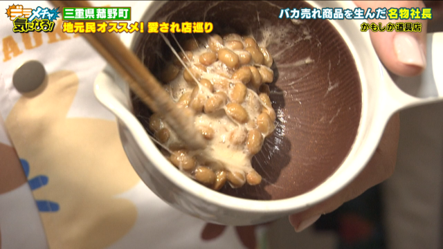 納豆を混ぜるための専用の器『なっとうバチ』です。この器で納豆を混ぜると、器の内側につけられたかすかな溝の効果で納豆に空気が入り、フワフワになるとのこと。さらに器の形も混ぜやすく洗いやすいように計算されています。最初は「これ、いりますー?」と首をかしげていたはるなでしたが、山口さんの説明に興味津々。早速体験です。